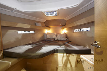 All'interno, il Dufour 410 offre un ambiente luminoso e accogliente, con finiture di pregio e un uso intelligente dello spazio. La cucina completamente attrezzata, il salone confortevole con ampi posti a sedere e le grandi finestre panoramiche creano un’atmosfera invitante. I layout configurabili offrono 3 cabine con letti spaziosi e bagni ben rifiniti, soddisfacendo ogni esigenza.